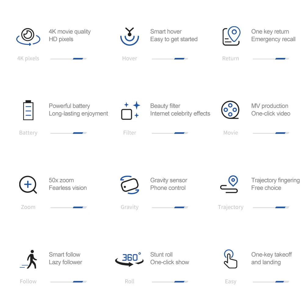 – One Key Take-off/Landing/Return. Easily find your way home using the one-button back function.